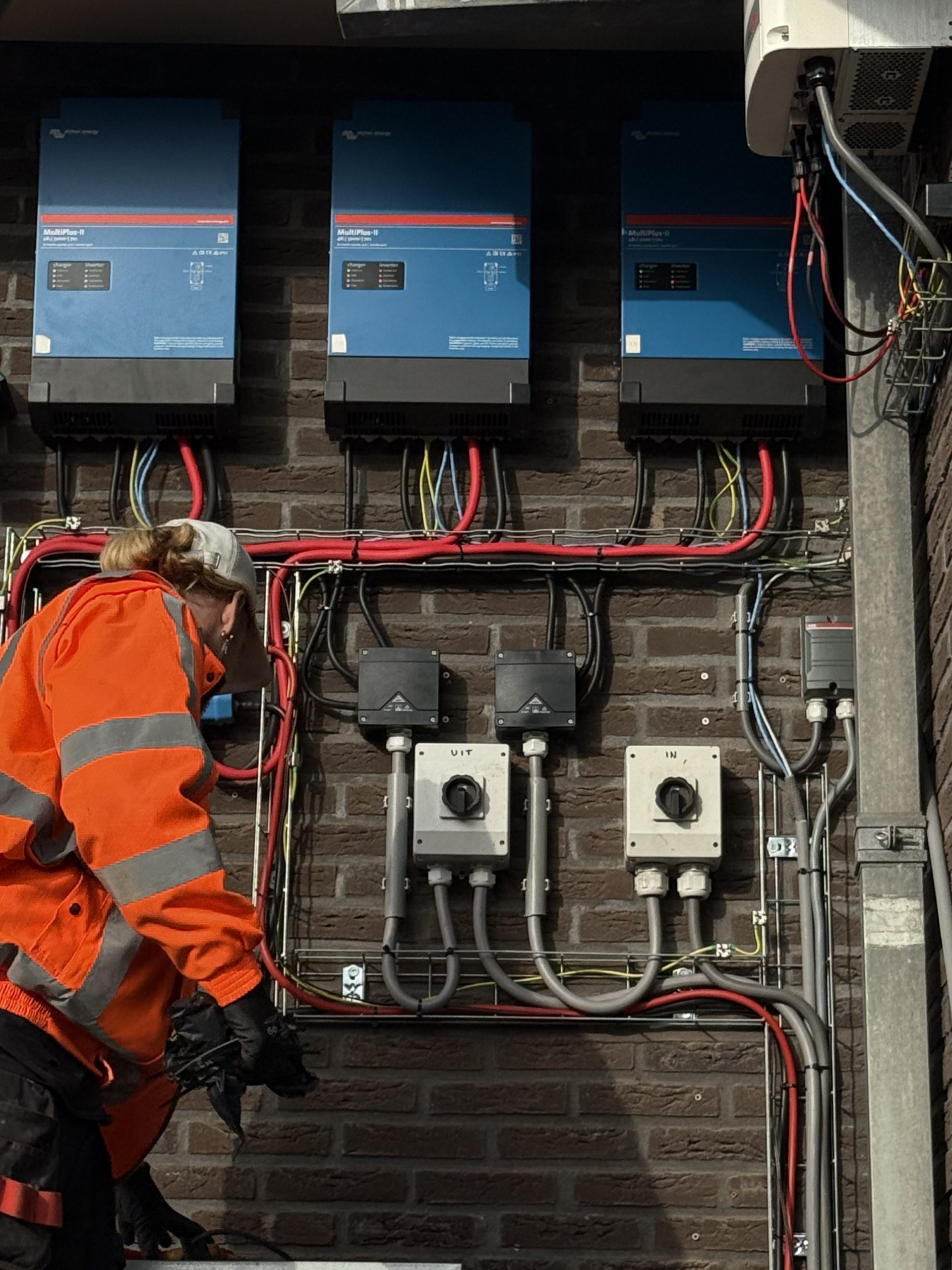 Waar veel installaties enkel stroom opwekken voor direct gebruik, hebben wij hier gekozen voor een hybride oplossing. Dankzij de geïntegreerde Victron-technologie (waaronder de MultiPlus-II omvormers, Cerbo GX systeem en Lynx Distributor) werkt alles naadloos samen. Dit zorgt voor een stabiel, efficiënt en slim energiesysteem dat precies weet wanneer het moet laden, ontladen of terugleveren aan het net.